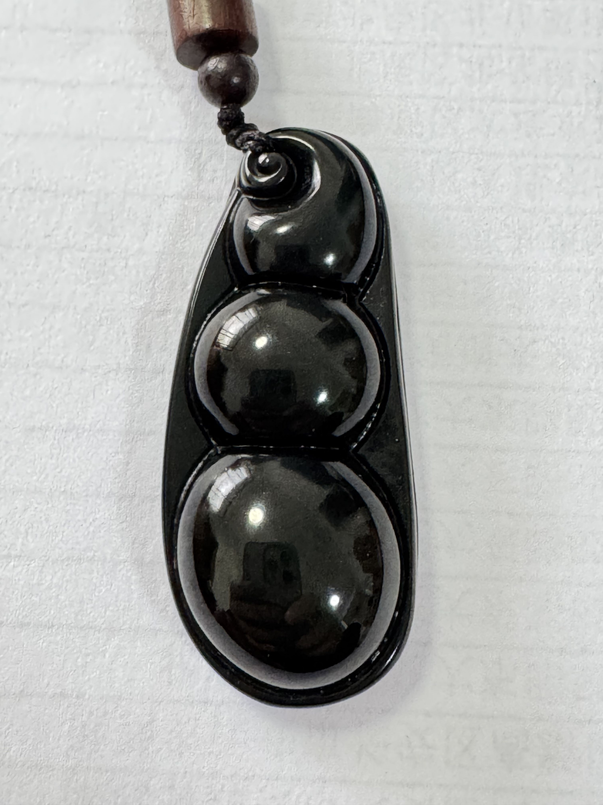 Inspired by the traditional “Prosperity Bean” motif, this masterfully crafted pendant features three elegantly curved beads carved from deep, midnight-hued volcanic stone. It symbolizes a harmonious life—balancing personal growth, professional success, and daily well-being. Its high-polished, glass-like luster offers a timeless aesthetic of stability and calm.